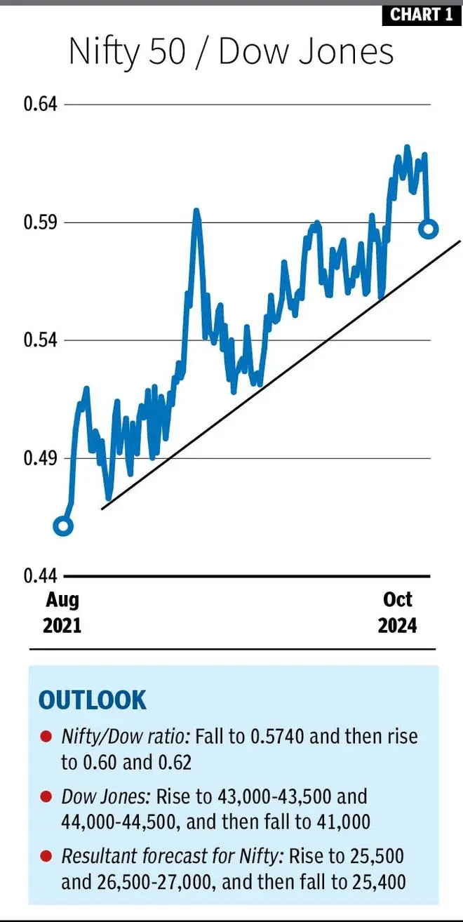 The Nifty/Dow ratio is at present at 0.5824. On the charts, the pattern is down. The ratio can fall to 0.5740 from right here in a month or two. On this interval, the Dow Jones will outperform the Nifty. Thereafter, the ratio can rise to 0.60 by the top of this yr. As we head into 2025, the ratio chart can prolong its rise in the direction of 0.62 within the first quarter subsequent yr.